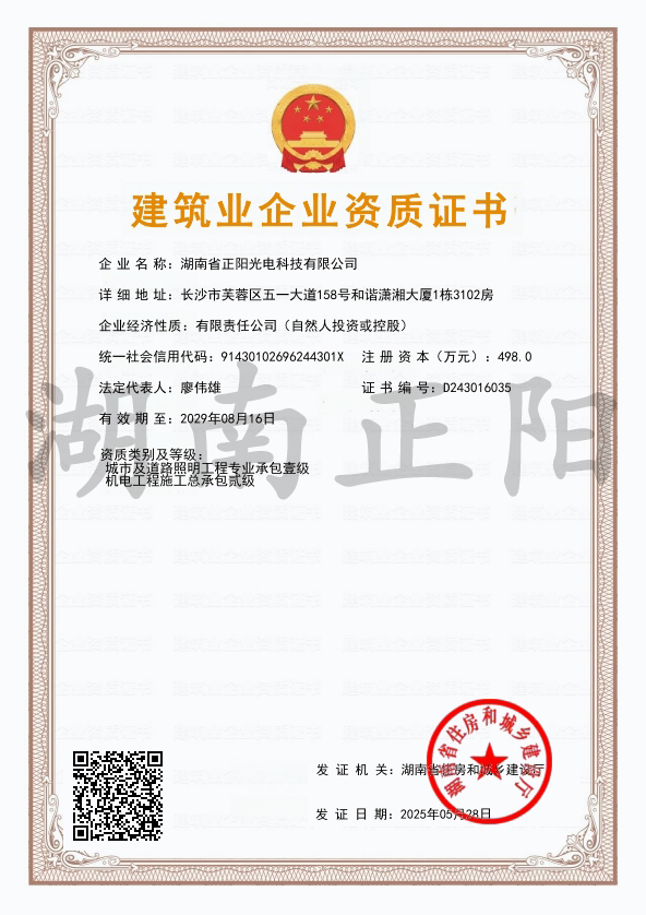 2025年5月28日,經(jīng)湖南省住房和城鄉(xiāng)建設(shè)廳審核批準,湖南省正陽光電科技有限公司成功獲得“機電工程施工...
